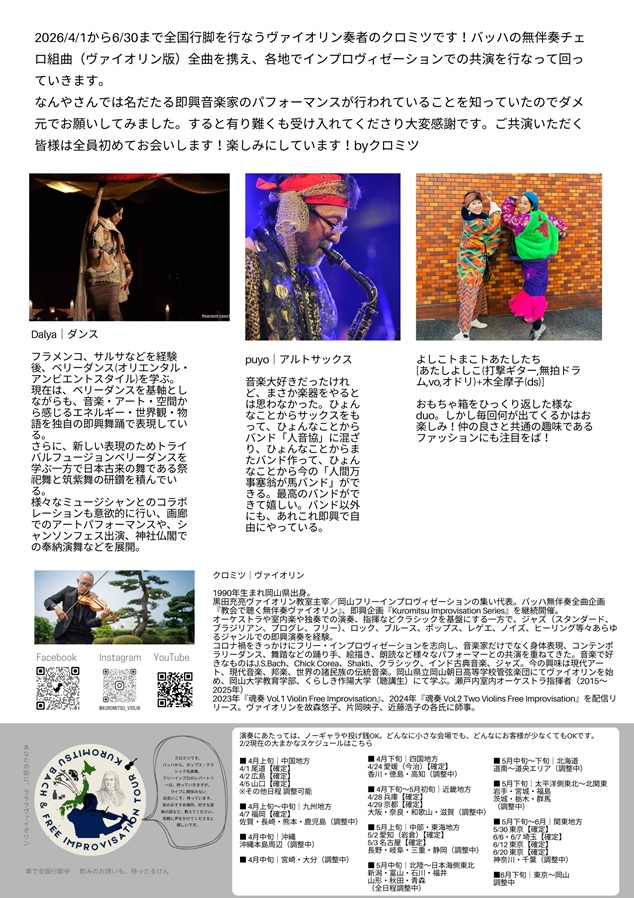 『ヴァイオリン奏者クロミツ全国行脚 J.S.Bach&Free Improvisation』と題し2026年4月1から6/30まで旅に出ている。
