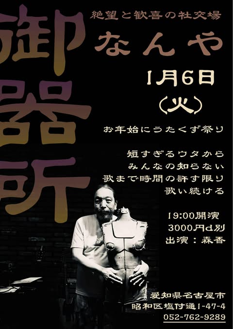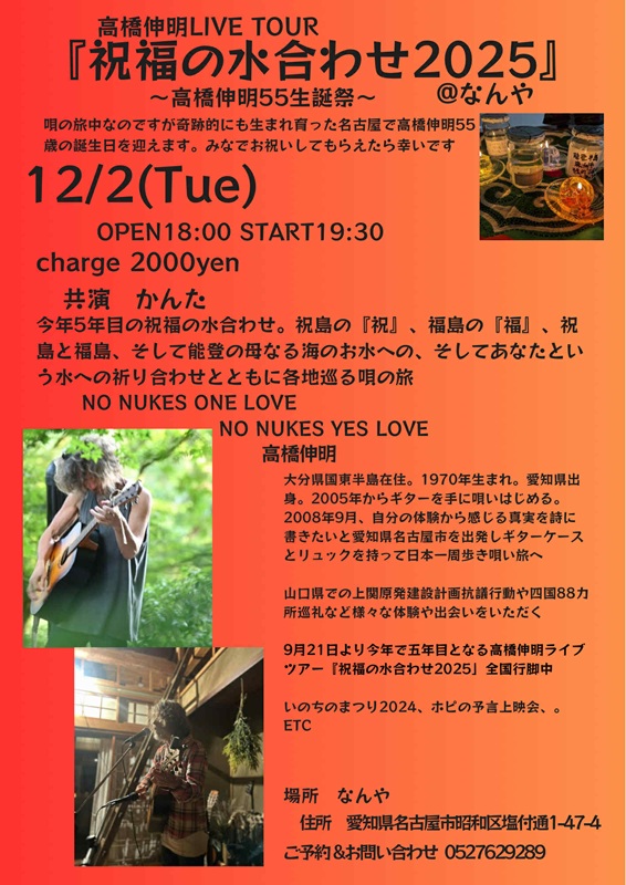 ★予約受付方法: 公演前日までに、なんや052-762-9289まで電話で、または、メールnanyagokiso@wing.ocn.ne.jp 宛メールまたは メールでの予約をお願いいたします。イベント名とその日付、お名前と人数、連絡先をお知らせくださいませ。