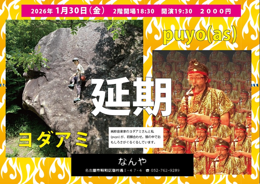 なんやの過去の出来事 2026年 2024年 2025年 2025年 1月から6月 12月30日(火)から1月5日(月)は年末年始休業です。よろしくお願いいたします。 1月6日(火) ライブ 19:00~ 3000円 お年始にうたくず祭り 森香(vo,g)単独お年始ライブ 短すぎるウタからみんなの知らない歌まで時間の許す限り歌い続ける。